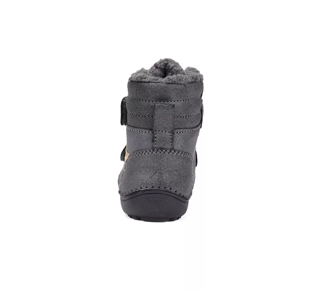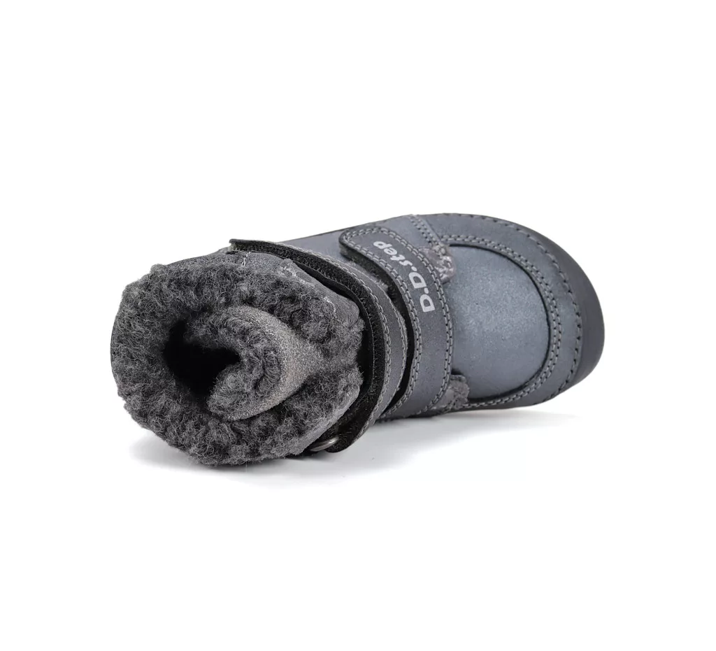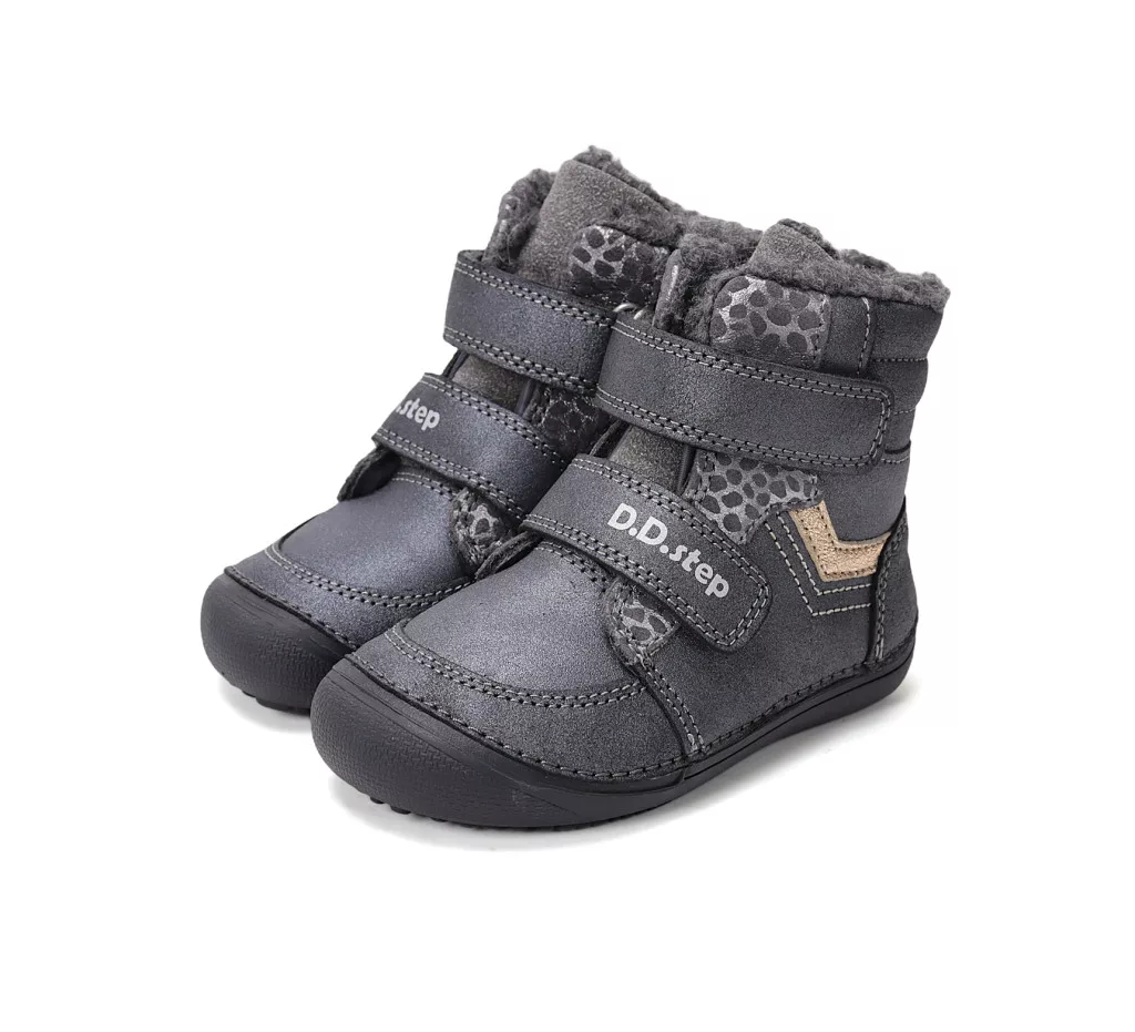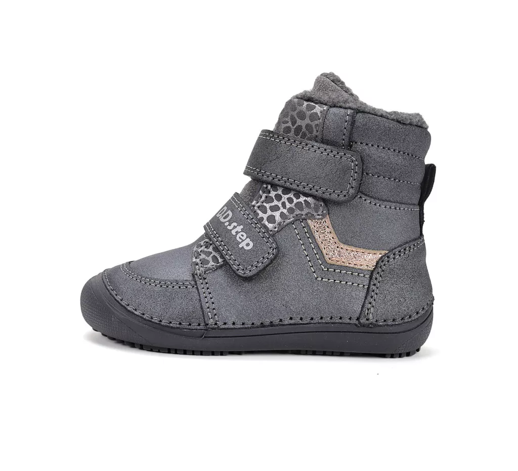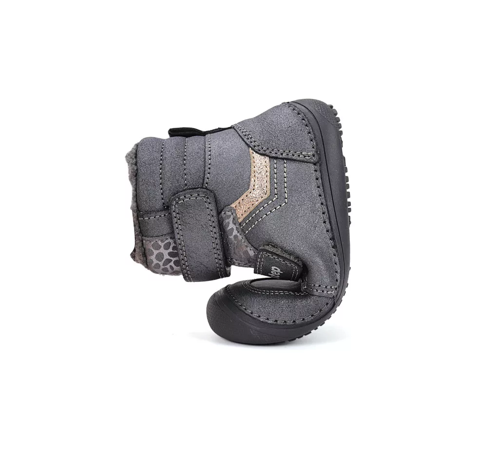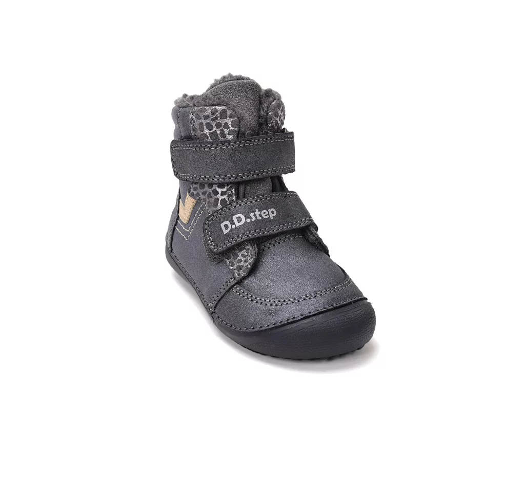 D.D.Step barefoot gyerek téli bakancs keskeny/normál lábra, műszőrme béléssel. A tépőzár meggyorsítja az öltözködést, és biztosan a lábon tartja a cipőt. A cipőorra és sarokra felkanyarodó talpgumi védi a bőrt a sérülésektől.